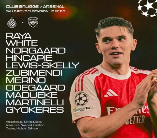 阿森纳客战布鲁日:哲凯赖什、马丁内利首发,马杜埃凯出战